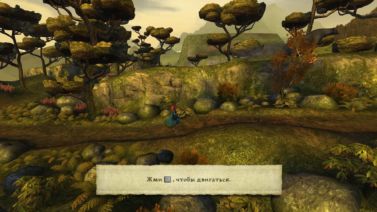 Во время загрузок вы будете наблюдать картинки из игры, нарисованные в своем неповторимом стиле. Внимательно читайте подсказки, они помогут лучше понять механику игры и сделать прохождение более интересным и насыщенным. Как и в оригинальном мультфильме, мама главной героини – медведица, начинается игра именно с этого момента. Главная героиня – рыжеволосая принцесса по имени Мерида, очень не любит быть прилежной ученицей своей мамы, которая хочет сделать из нее настоящую принцессу. Девочке куда милее бегать по лесам, стрелять из лука, драться на мечах и гонять на лошади. В ее жилах течет кровь отца, короля Фергюса, этот огромный рыжебородый правитель истинный воин и охотник, его мало заботят дела королевства. Всем в замке заправляет заботливая мать и любящая жена королева Элинора.
